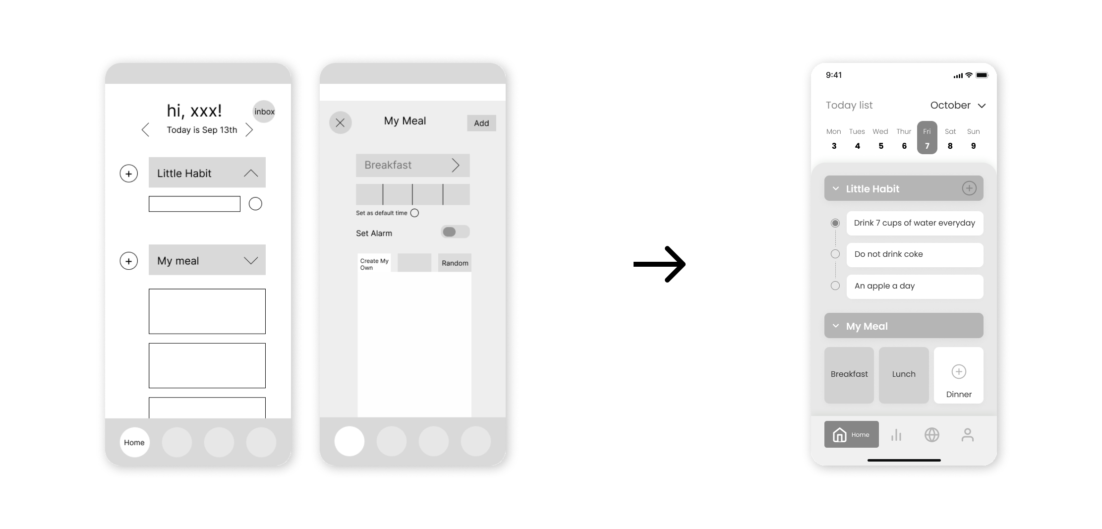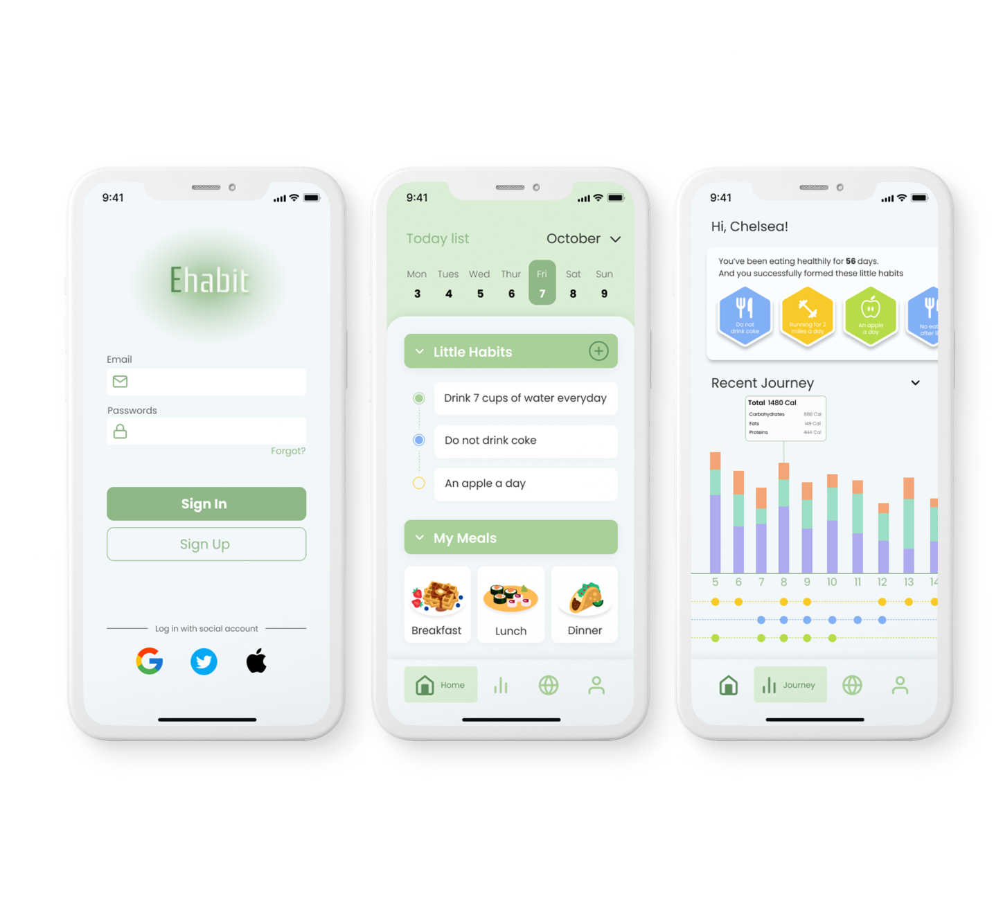 After rounds of peer reviews, I received the suggestion that should combine little habits and meals together in order to show the overall improvements and performance of the user. So I changed the calendar tab to the journey.