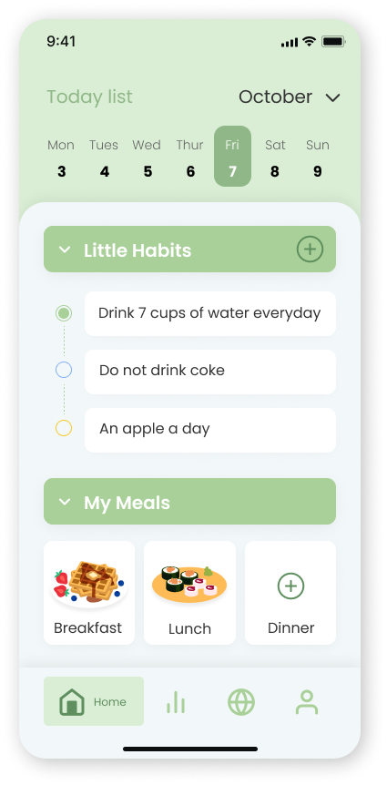 Originally designed a calendar tab to collect data on little habits and meals respectively from time to time.