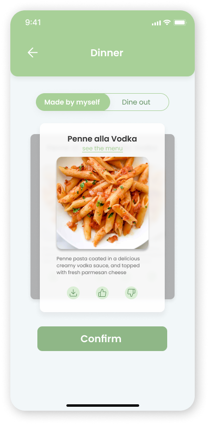 Scientifically generate healthy recipes and menus according to the ingredients you have. Choose like or dislike depending on your choices, the app will record and calculate the calories and nutrition automatically.
