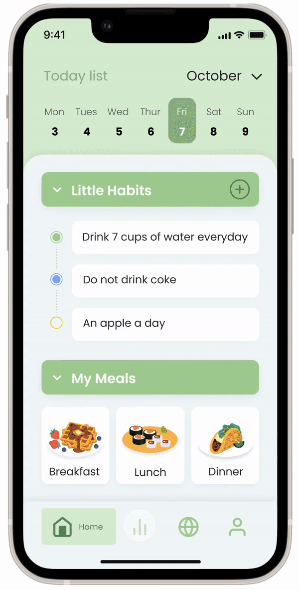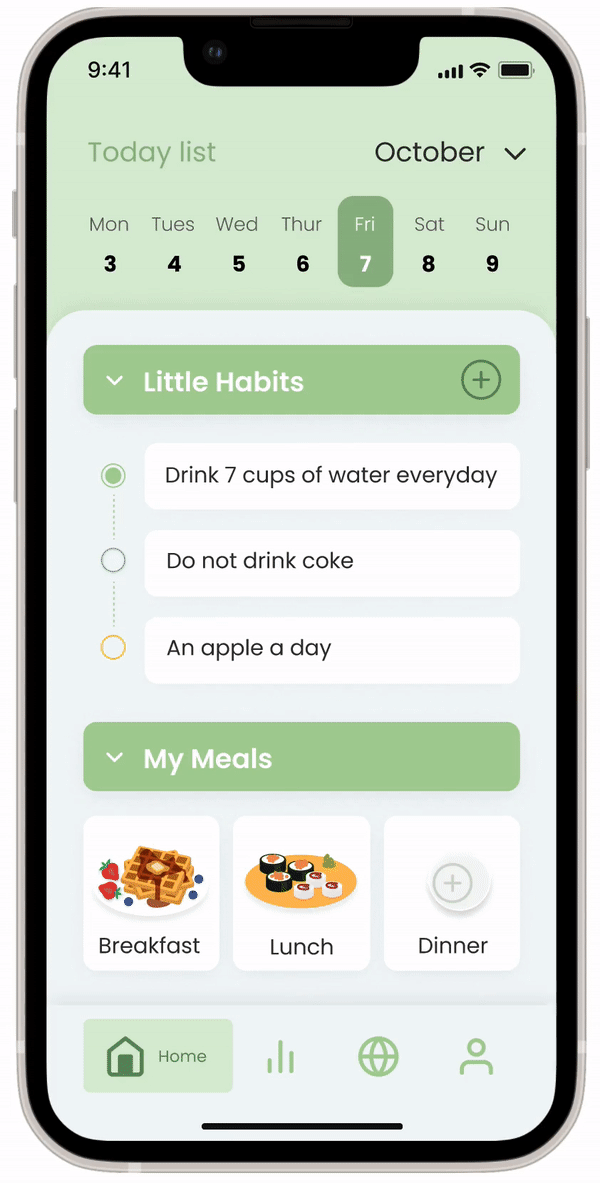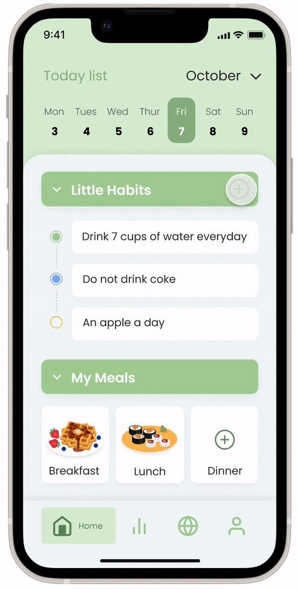Original design was to check your little habits after clicking into the “habit bar“. Also, choose which meal you have after clicking into the “meal bar“.