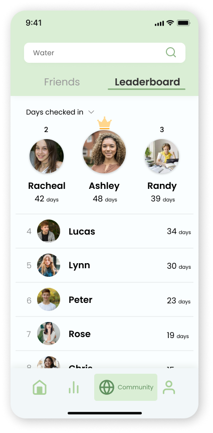 Sharing your healthy life with friends is the most happiness moment! That is also a good way to help supervise each other. At the same time, we can also find out who did a good job in a certain field. Tips: the leaderboard content can be changed!