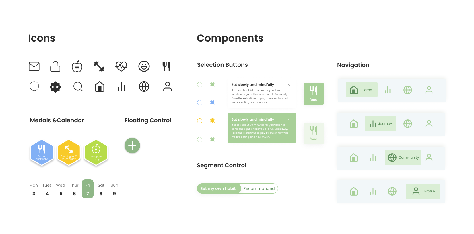 In my journey, you can clearly view your everyday nutrition input and calories. As well as the recording of checking in little habits. There will also be a library for your medals for accomplishing different goals.