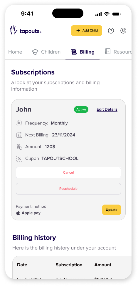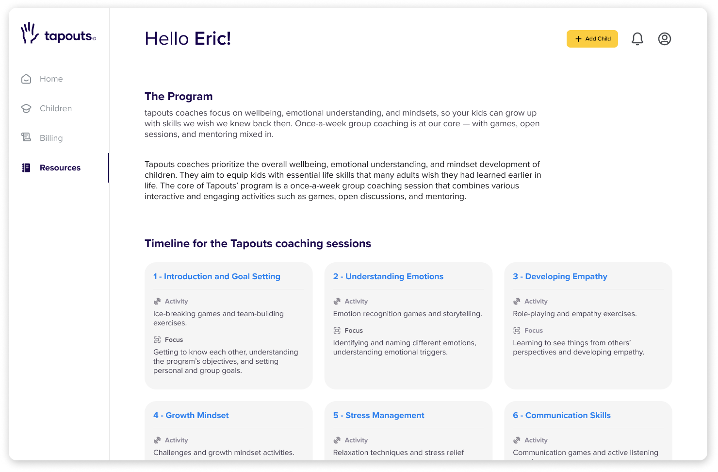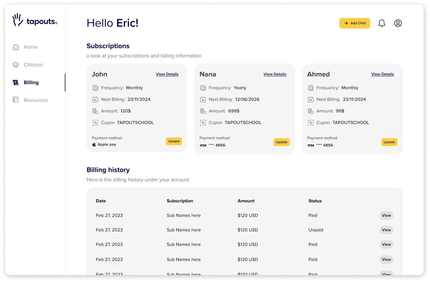 This project aimed to design and develop the Parent Portal for Tapouts, a platform connecting tapouts with parents and students. The Parent Portal focuses on providing parents with an easy way to track their child’s progress, manage class schedules, and handle payment and billing information.